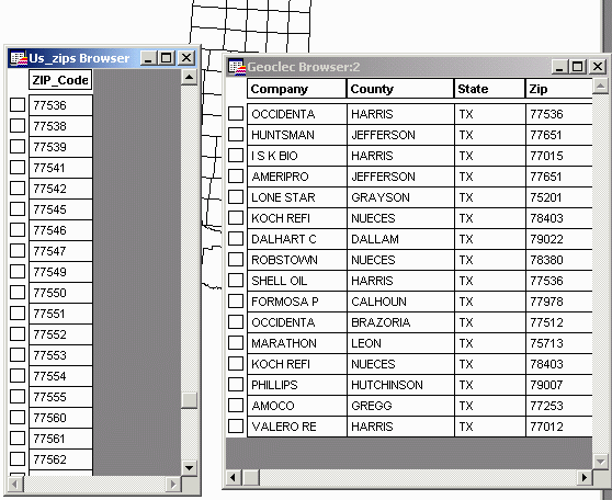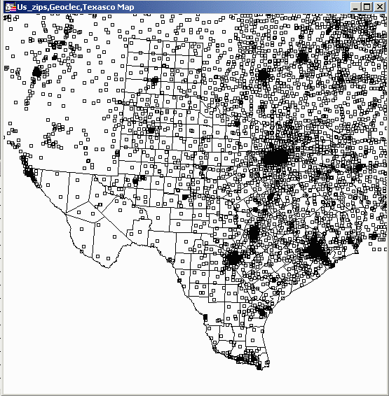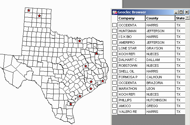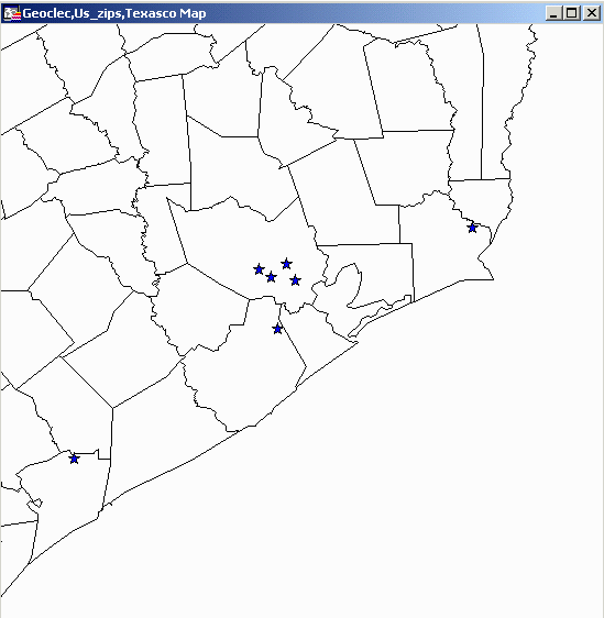 Figure 6. Geoclec.tab geocoded by zip. The 4 records in Harris County are in different zip codes.